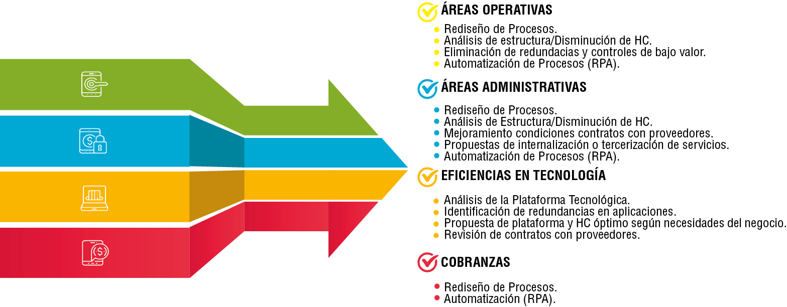 Nuestra visión integral de los Procesos Operativos y de Apoyo, nos permiten generar e implementar propuestas de eficiencia a estos, tanto en el ámbito funcional, así como, con nuestras herramientas de automatización de Procesos.