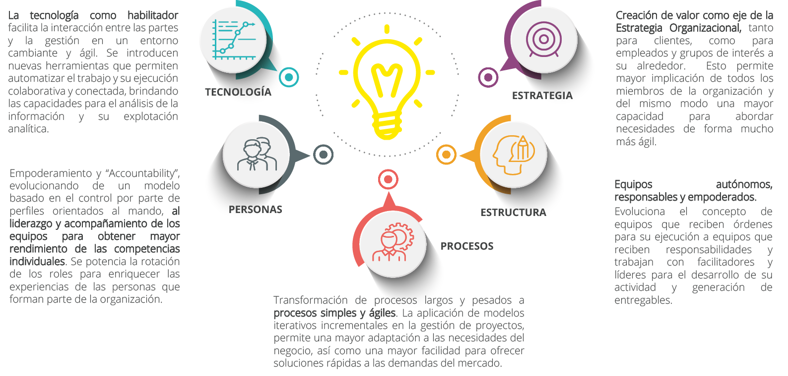 Las 5 características mas representativas que debe tener una Organización Ágil son: