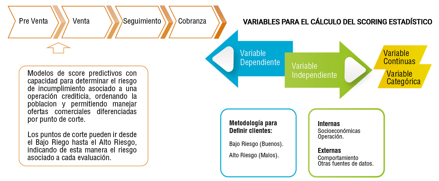 Si bien los modelos score pueden ser aplicados en cualquier momento del ciclo continuo del crédito, este modelo permite medir la probabilidad de pago del cliente.